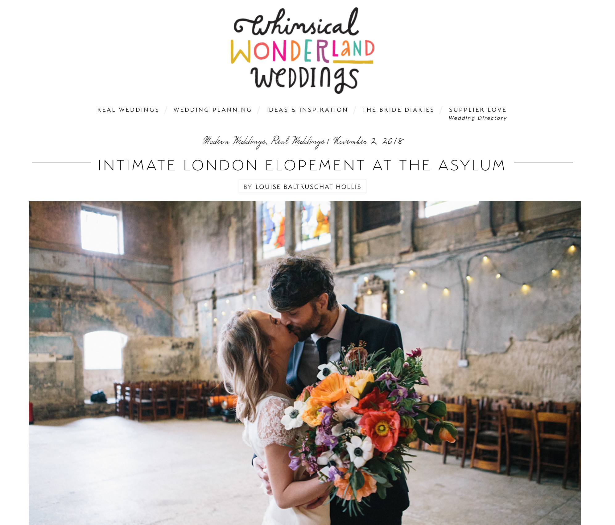 Jessie & Marc’s elopement at The Asylum in Peckham has been featured on Whimsical Wonderland Weddings! You can view the feature HERE.